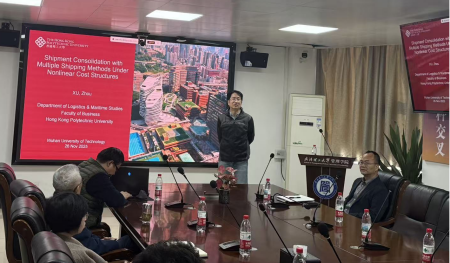 11月26日下午,管理学院学术讲座在学院311会议室顺利举行。本期讲座主题为“非线性成本和多种运输方式下货物合并运输的优化方法”,由香港理工大学徐宙教授主讲,管理学院部分教师以及硕士研究生近40名师生共同参与。管理学院刘军副院长主持了本次讲座。