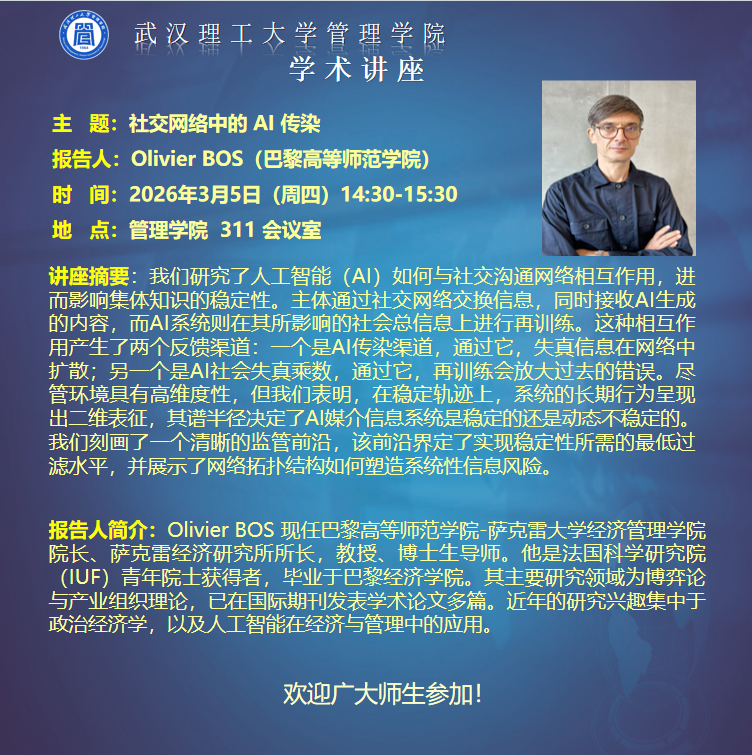 地址:武汉市洪山区珞狮路122号 武汉理工大学管理学院 邮编:430070 Copyright © 武汉理工大学管理学院 All Rights Reserved