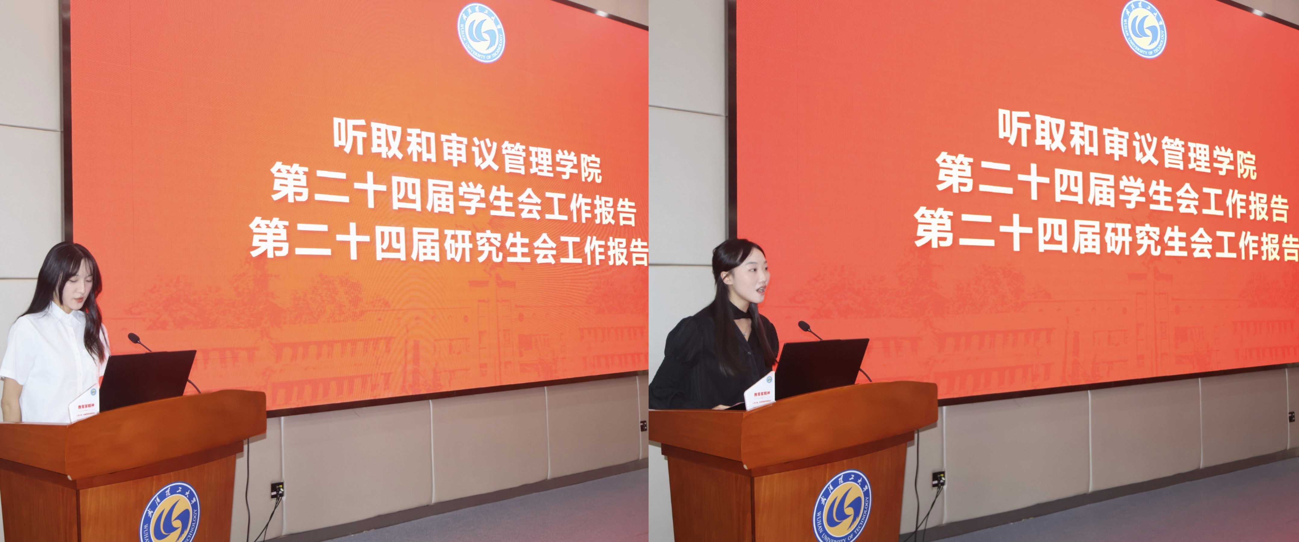 随后,管理学院学生会代表邹旭阳同学、研究生会代表钱渝同学分别作2024-2025学年工作报告,与会师生代表共同听取并审议。