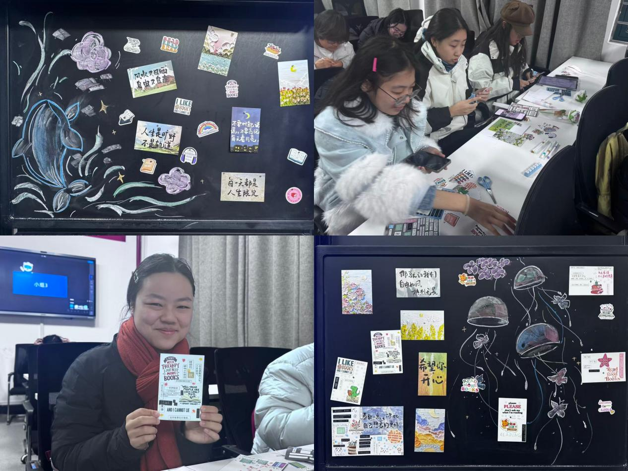 本次幸福探索之旅设置两个互动环节:在“书香幸福手账”环节,同学们先在主持人引导下回顾近期幸福瞬间,再用素材包中的书籍片段、贴纸搭配现场集章,拼贴出专属手账;而“字句飞花令”环节里,成员们则结合自身幸福细节,根据领取的基础诗句卡片与空白贴纸,自由组合创作“幸福小诗”。随后的成果展示阶段,各小组代表依次上台展示手账及拼诗成果,真挚的分享引发了全场共鸣,让幸福的感知在现场流动。