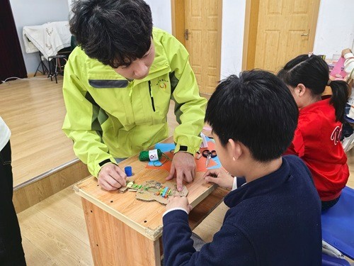 在“手工吉他”制作环节,志愿者们首先向孩子们展示了所需材料:提前裁剪纸板、棉线、胶水以及画笔。考虑到安全因素,志愿者老师在开始做手工前详细讲解了需要注意的安全问题。随后,志愿者分步骤讲解制作流程:先用胶水将纸板按设计粘贴成型,再在预留孔中穿入棉线作为琴弦,最后用画笔在吉他上绘制喜欢的图案或文字。孩子们兴致勃勃地动手操作,遇到困难时互相帮助、主动请教志愿者,志愿者们也十分细心的为孩子们讲解,帮助孩子们完成手工,现场气氛热烈而有序。不一会儿,一把把独具创意的手工吉他便在孩子们手中诞生,大家纷纷举起作品展示,脸上洋溢着自豪的笑容。
