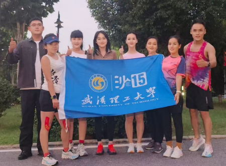 10月3日同样于东湖边6:00开跑,沙赛组委会刘凤小姐姐从西安远道而来专程陪跑,带领队员进行专业拉伸。在经充分热身后队员们举着印有"武汉理工大学"校徽的蓝色旗帜,在东湖边合影留念,形成清晨最靓丽的风景线。