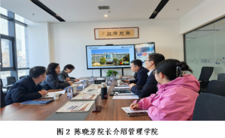 在交流中,陈晓芳院长就管理学院的历史发展、科研教学成果、产学研合作等内容做了详细介绍。尤其是关于管院的产学研合作,培训等工作有国内外丰富的案例阐述。陈院长的介绍引起了与会的大湾区科技创新武汉中心负责人的强烈兴趣,并就此探讨了产学研合作的相关细节和关键问题。